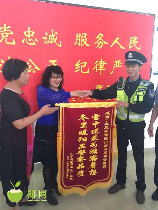 12月14日下午,東北游客程女士的母親和阿姨將一面表著(zhù)“濟困扶危為游客考慮 冬里暖陽(yáng)顯差人質(zhì)量”的錦旗送到友誼派出所,以表達自己的感謝之情。“在我們最無(wú)助的時(shí)分,三亞差人讓我們感觸到了城市的溫暖”她們屢次向記者如是說(shuō)。